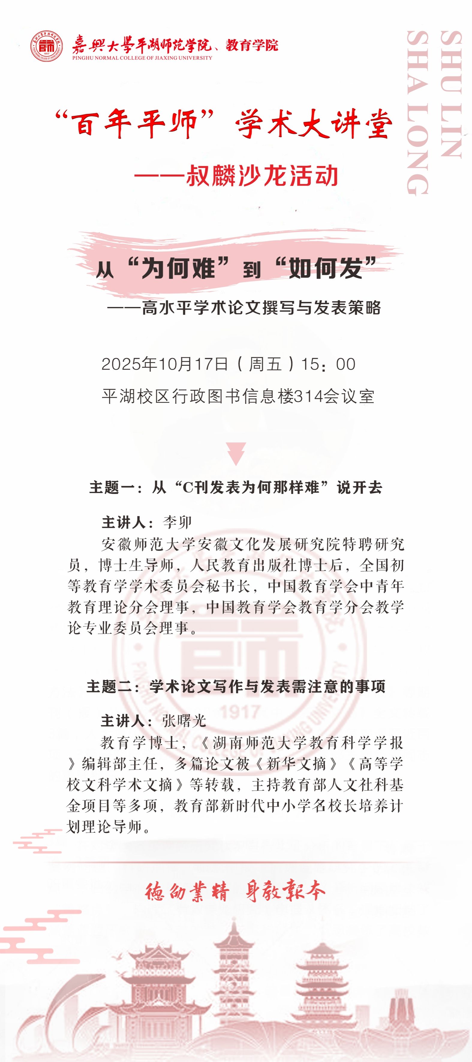 “百年平师”学术大讲堂——叔麟沙龙第一期:从“为何难”到“如何发” ——高水平学术论文撰写与发表策略 报告人:李卯、张曙光 时 间:2025年10月17日(周五)15:00 地 点:平湖校区行政图书信息楼314会议室