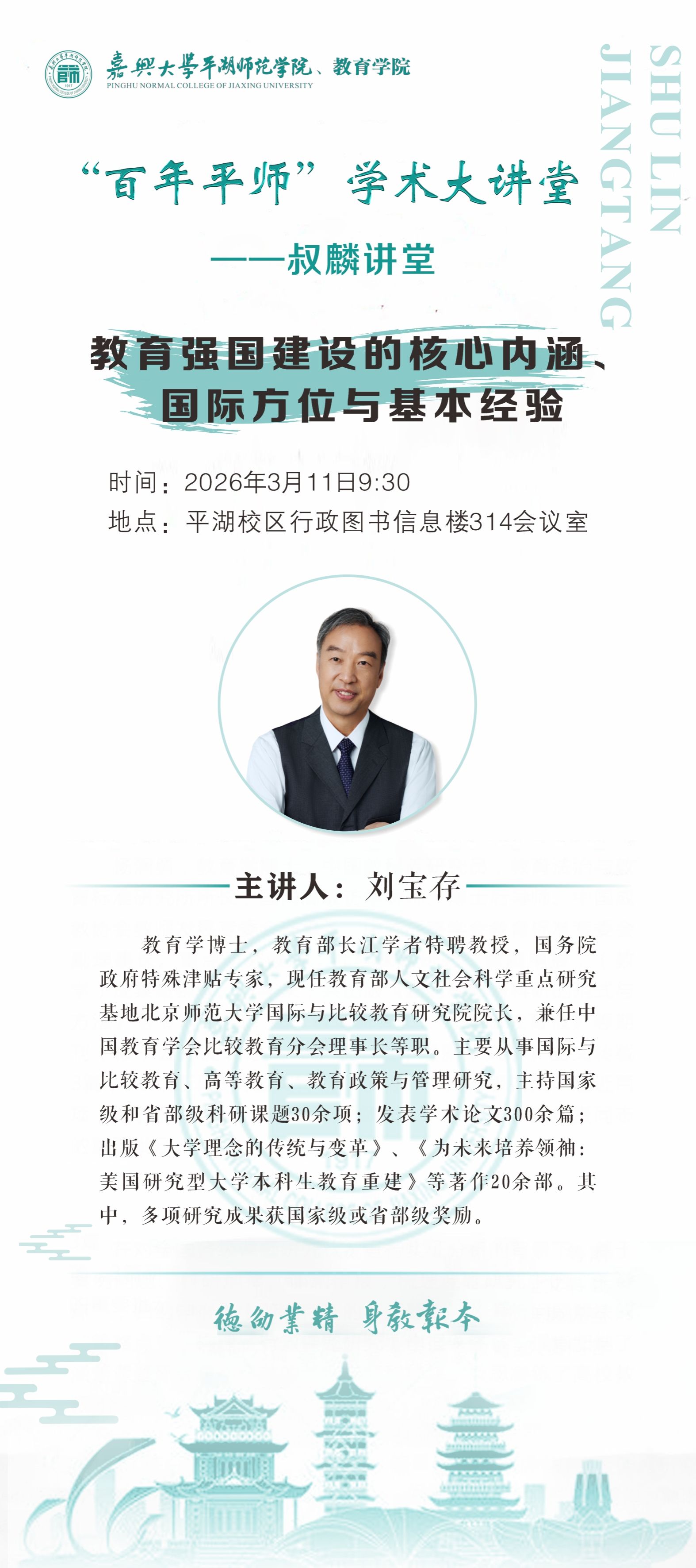 教育强国建设的核心内涵、国际方位与基本经验 报告人:刘宝存 时 间:2026年3月11日(周三)9:30 地 点:平湖校区行政图书信息楼314会议室
