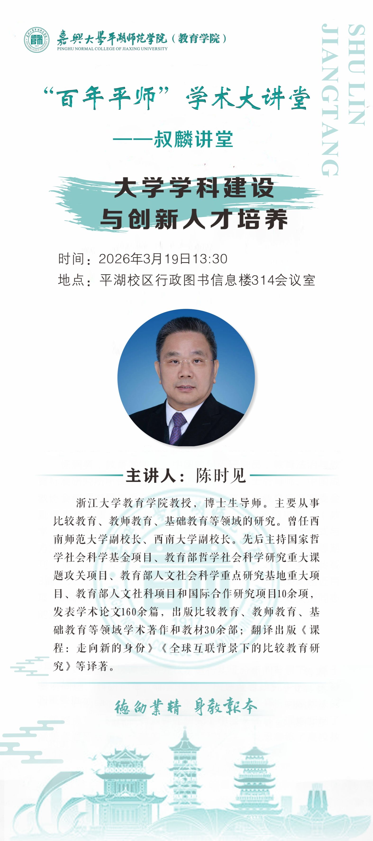 “百年平师”学术大讲堂——叔麟讲堂:大学学科建设与创新人才培养 报告人:陈时见 时 间:2026年3月19日(周四)13:30 地 点:平湖校区行政图书信息楼314会议室
